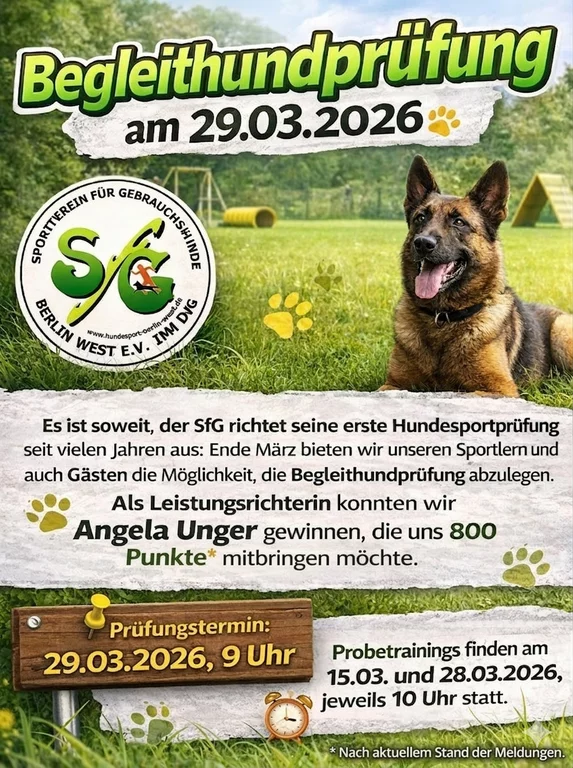 Es ist soweit, der SfG richtet seine erste Hundesportprüfung seit vielen Jahren aus: Ende März bieten wir unseren Sportlern und auch Gästen die Möglichkeit, die Begleithundprüfung abzulegen.