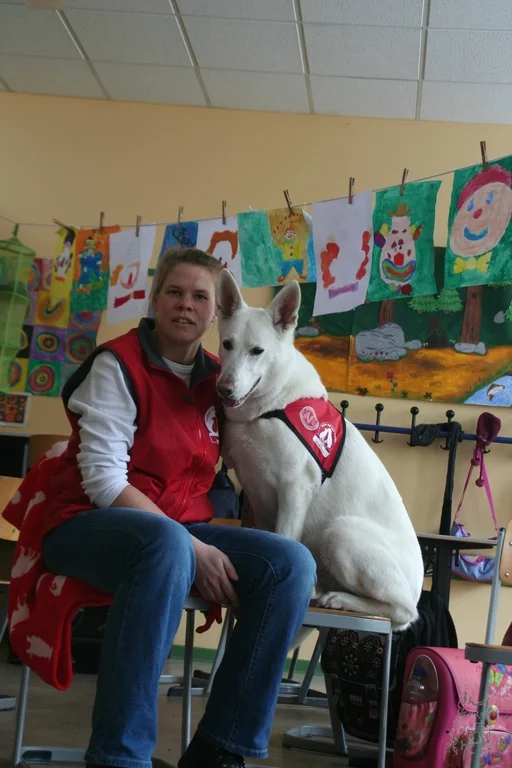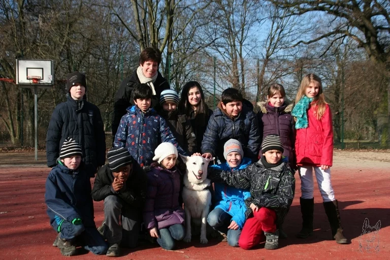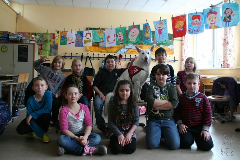 Heute ging es für Panyas zweiten Besuch in die Columbus Grundschule in Reinickendorf. 12 Kinder warteten hier auf die Weiße Schäferhündin.