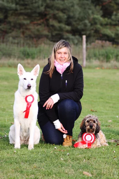 Mit Startnummer 7 ging Melanie an den Start. Sie wusste um was es ging und konnte die Spannung bis zur Freifolge halten. Brioche machte dann ein zu langsames Sitz, aber saß – puh; letzte Technik: Platz – klappte, leider hatte Melanie keine Spucke mehr im Mund, so dass das Abrufen sehr kläglich ausfiel, was Brioche nicht hörte – also Doppelkommando und ein ganz schräges Vorsitzen, da man ja Mama sehen wollte :-). Egal – 54 Punkte – der erste Schritt für die zweite Qualifikation. Die Freude war groß, bei uns Dreien.