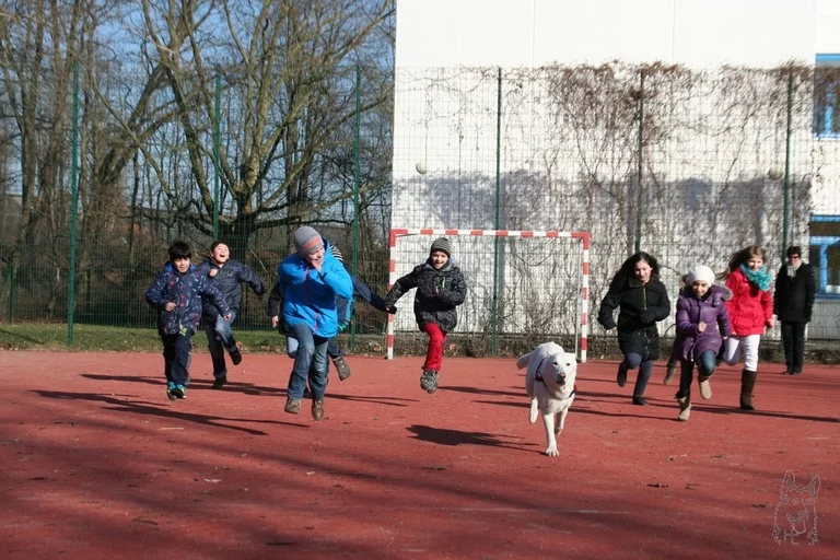 Als wir heute an der Schule ankamen, schien die Sonne mit voller Kraft. Bei so einem schönen Frühlingswetter macht der Unterricht mit dem „Helfer auf 4 Pfoten“ draußen noch viel mehr Spaß. Also unterhielten wir uns noch einmal kurz über die Goldenen Regeln und ich erklärte den Kindern die Verhaltensregeln für die gemeinsame Arbeit mit Panya draußen. So hieß es Jacken an und raus auf den Hof! Im „Affenkäfig“ bildeten die Kinder dann einen Tunnel, durch den Panya durch flitzte, sie führten Panya ohne Leine durch einen Slalom, riefen sie zu sich und durften kleine Tricks mit ihr machen und am Ende gab es ein großes Wettrennen für alle. Hier konnte Panya ihre ganze Sportlichkeit zeigen und so hatten die Kinder im Wettrennen keine Chance.